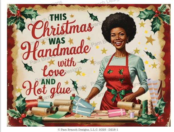 Bring humor and handmade holiday cheer into your craft room! This vibrant 8×6 rice paper for decoupage features a retro-inspired, Black woman with an afro wrapping gifts, surrounded by festive holly, ribbon, and rolls of wrapping paper.  This playful design celebrates every crafter’s secret weapon—hot glue!