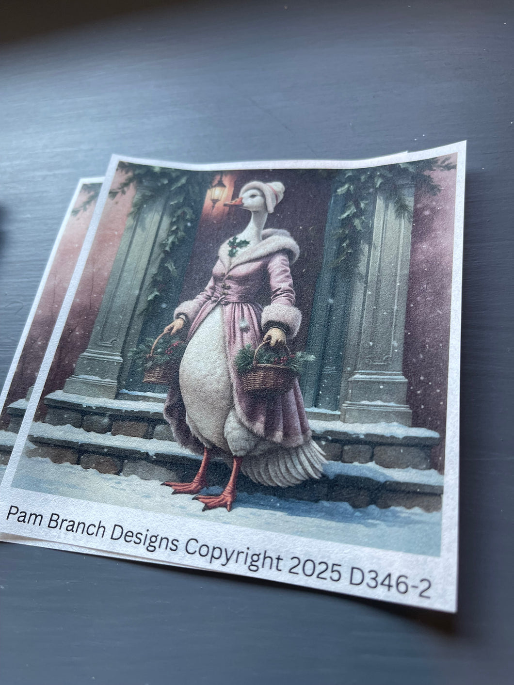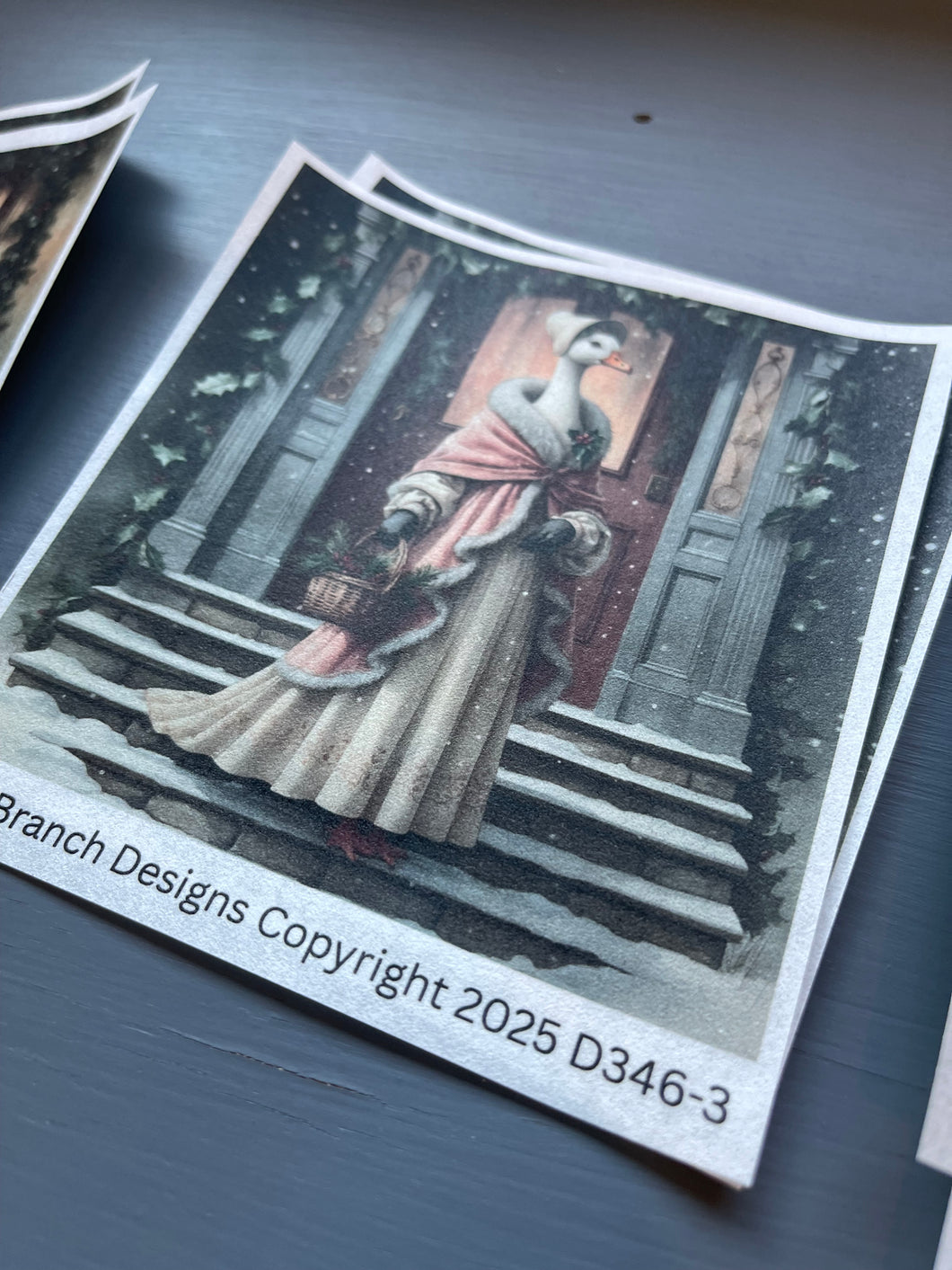 This variety pack of rice paper features four Victorian Christmas geese posed on snowy front steps in front of elegant building entrances framed with evergreen garlands and holly. Each design shows the goose holding wicker baskets filled with pine and berries, perfect for festive projects.
