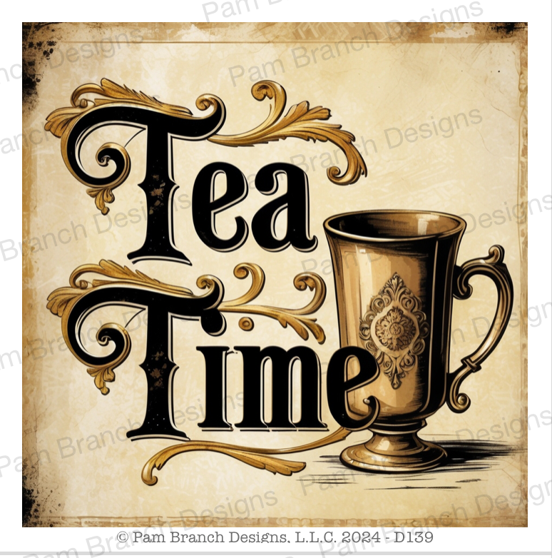 Vintage "Tea Time" image decoupage paper with decorative scrolls. Rice paper image has an aged look of an old fashioned sign. The image is 4.5 x 4.5”. The image is printed on white rice paper. Purchase includes 4 printed rice paper sheets. (Watermark will not appear on purchased image.)